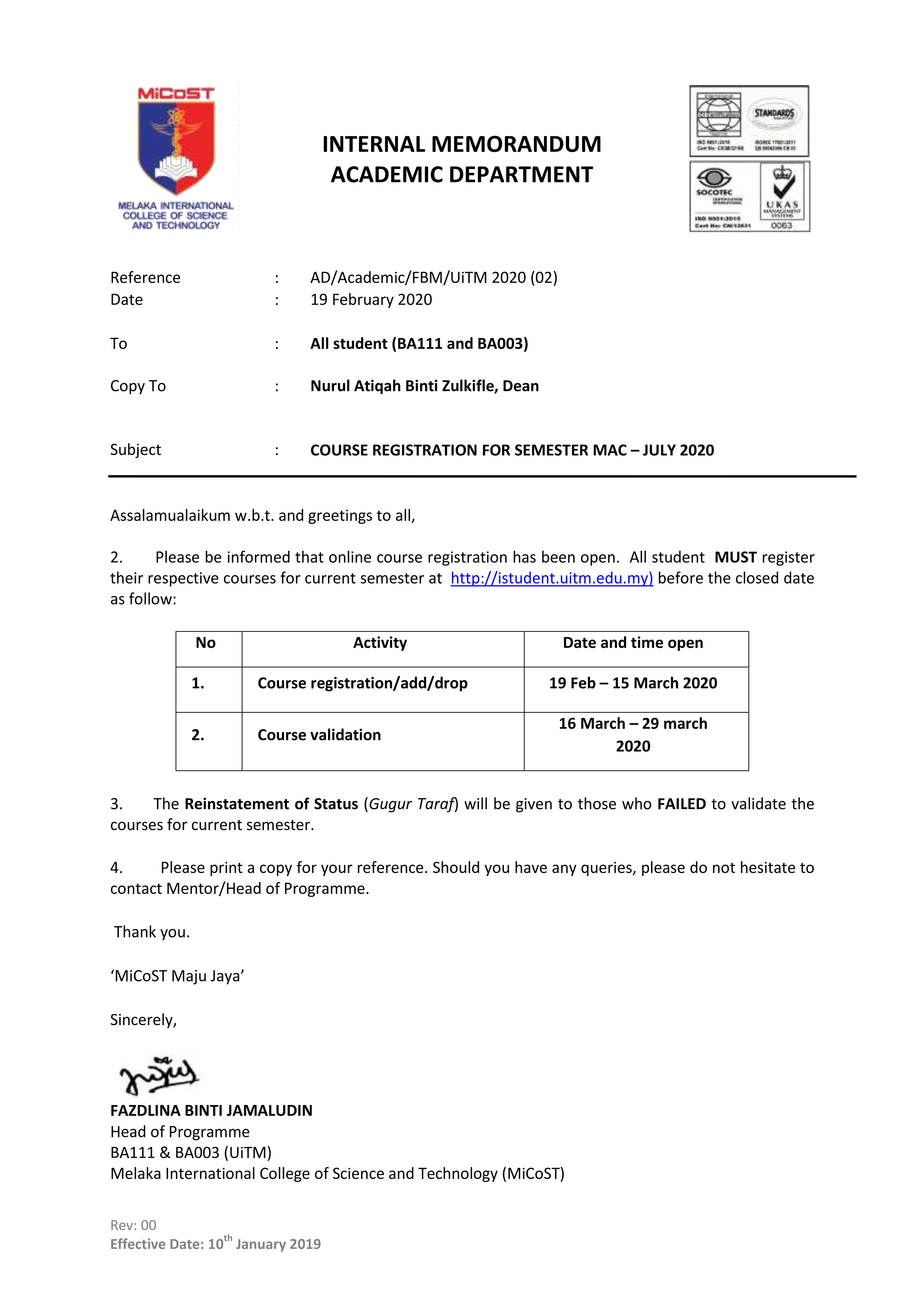 COURSE REGISTRATION FOR SEMESTER MAC – JULY 2020
