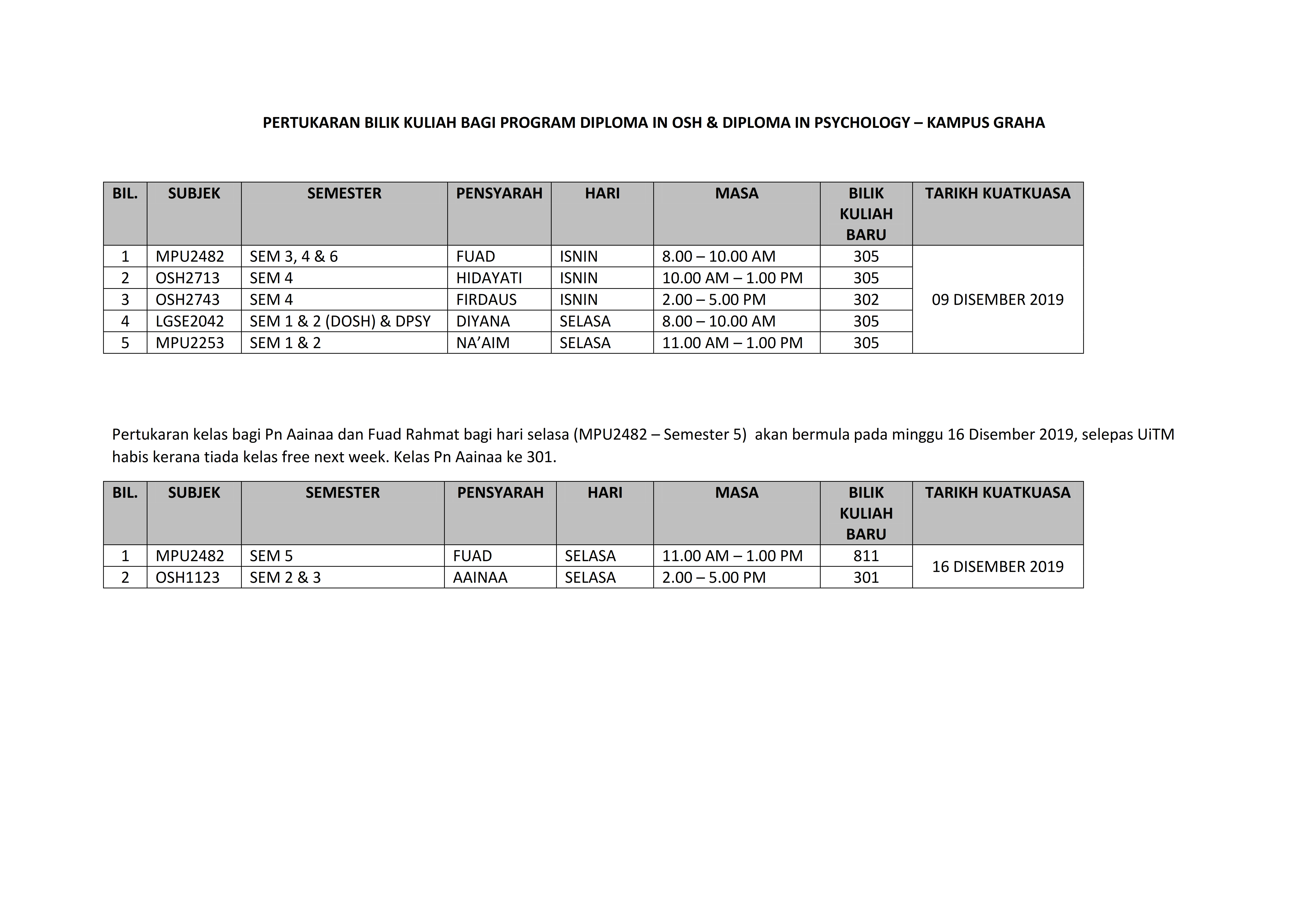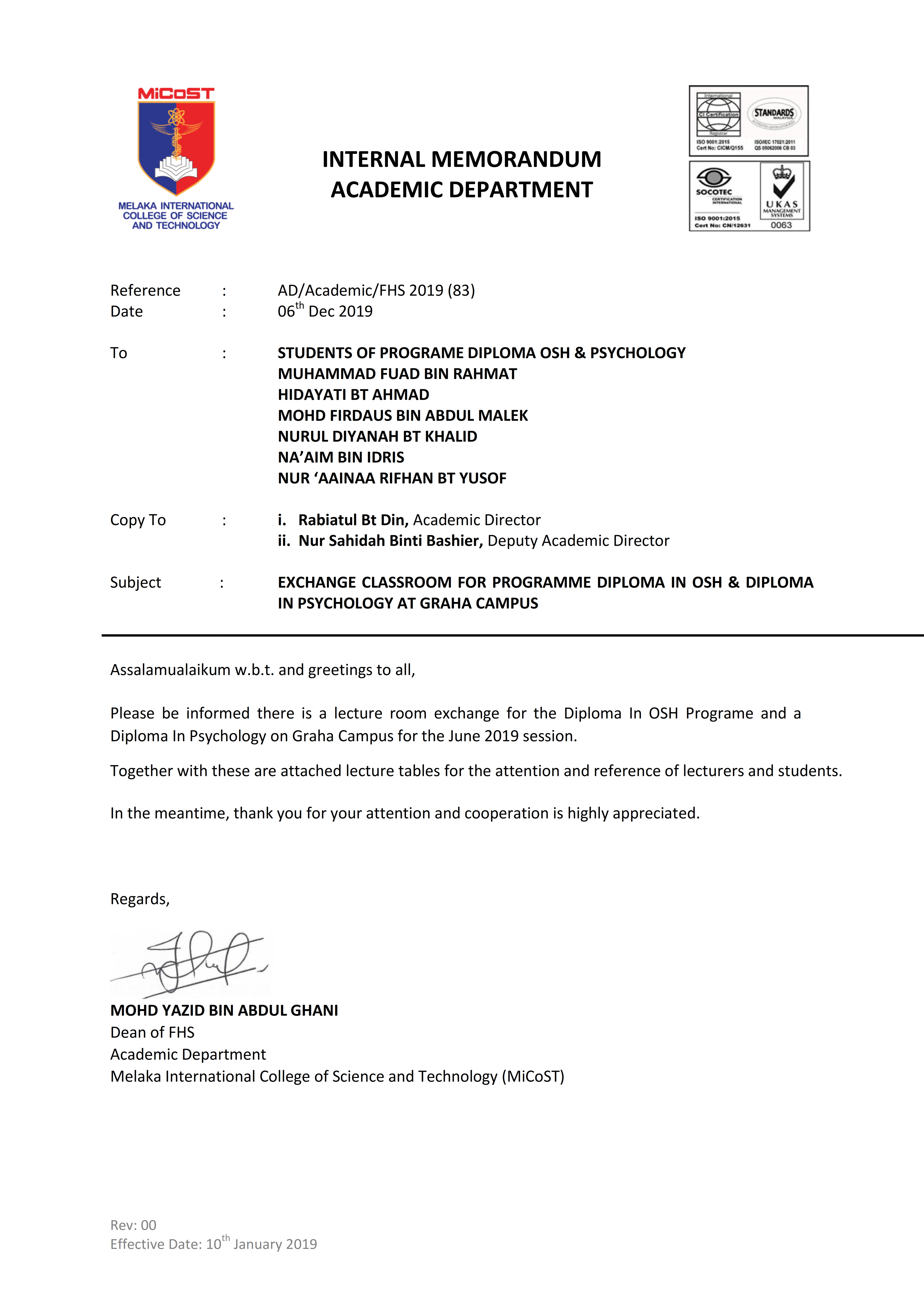 EXCHANGE CLASSROOM FOR PROGRAMME DIPLOMA IN OSH & DIPLOMA IN PSYCHOLOGY AT GRAHA CAMPUS
