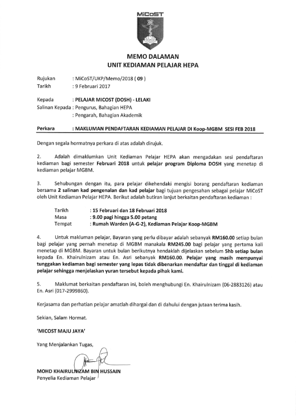 MAKLUMAN PENDAFTARAN KEDIAMAN PELAJAR DI Koop-MGBM SESI FEB 2018 (DOSH)
