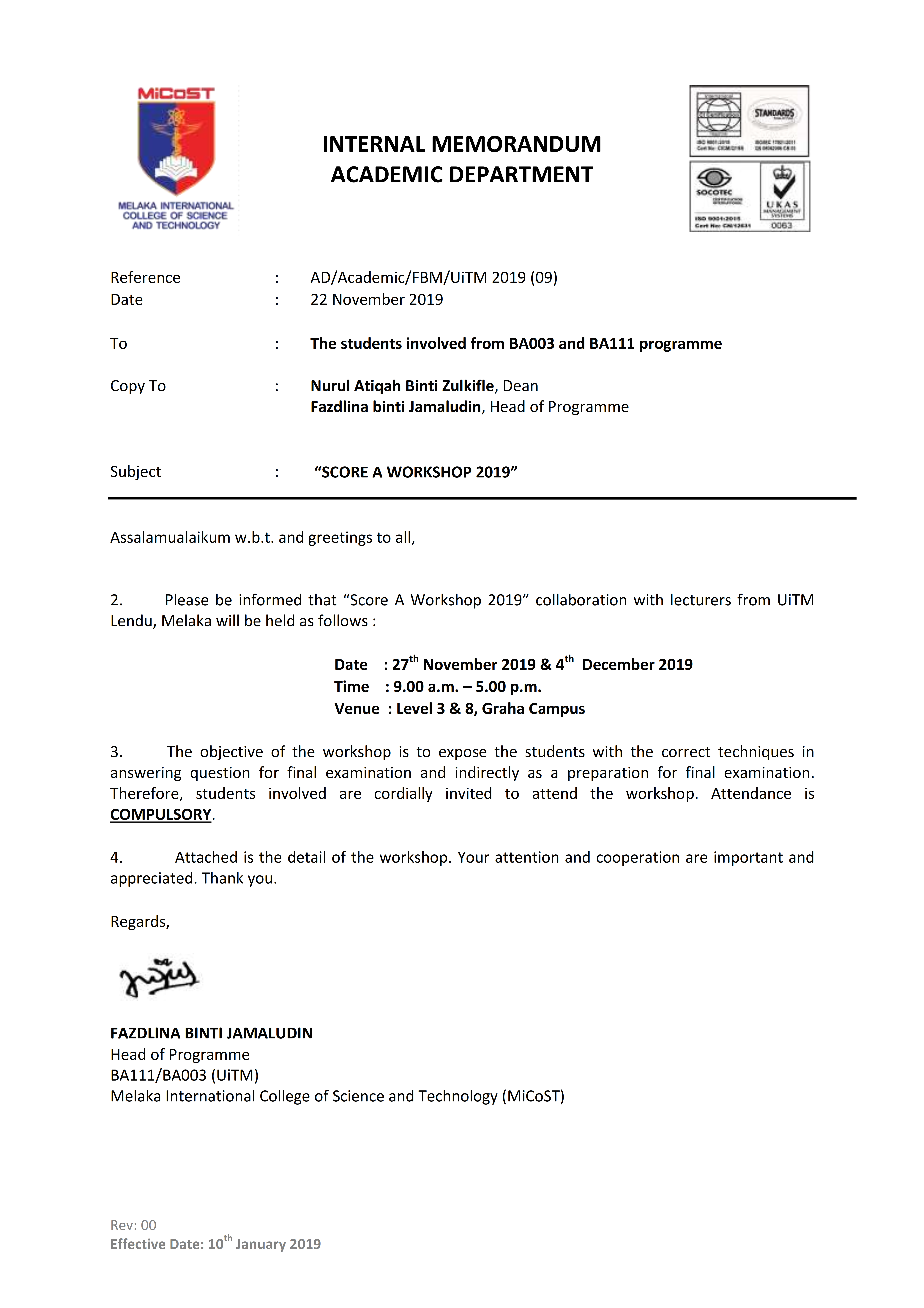 MEMO FOR STUDENTS SCORE A WORKSHOP SEPT 2019