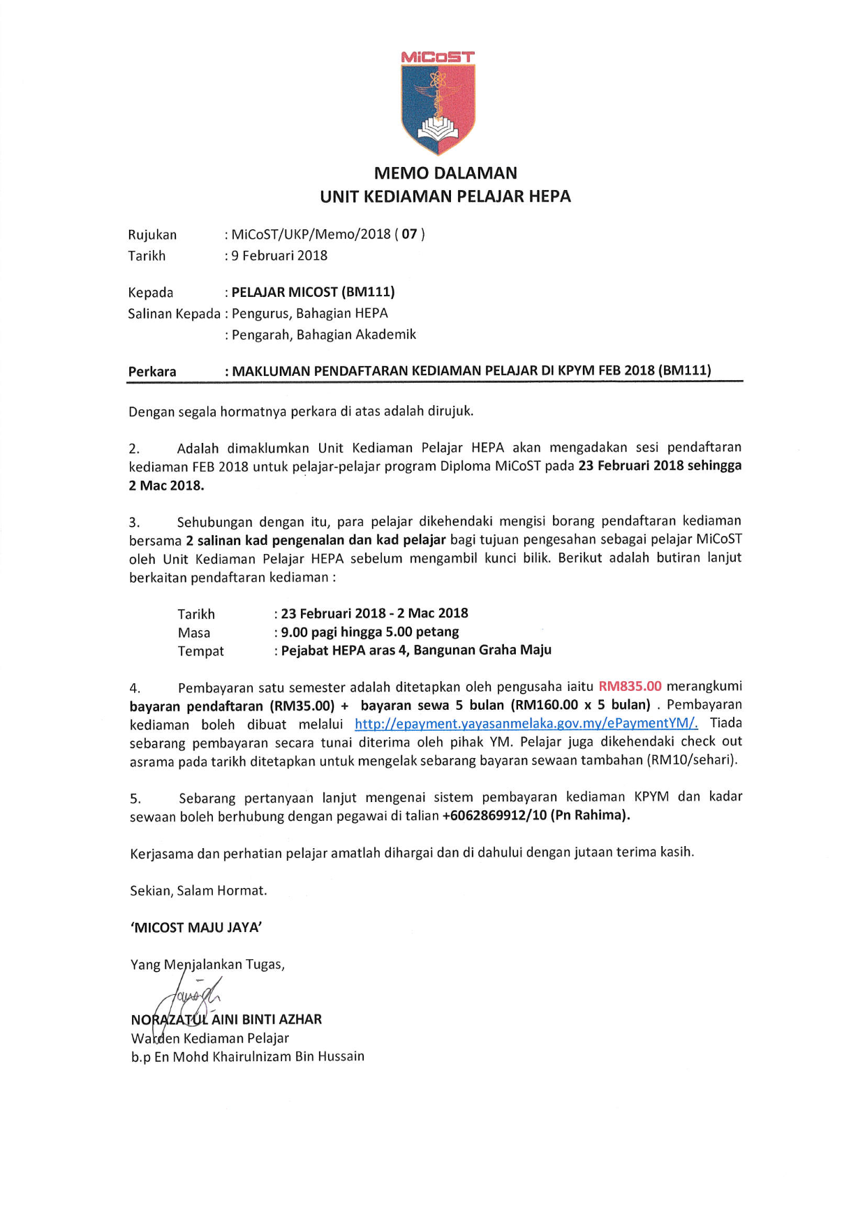 MEMO MAKLUMAN PENDAFTARAN KEDIAMAN KPYM FEB 2018 (BM111)