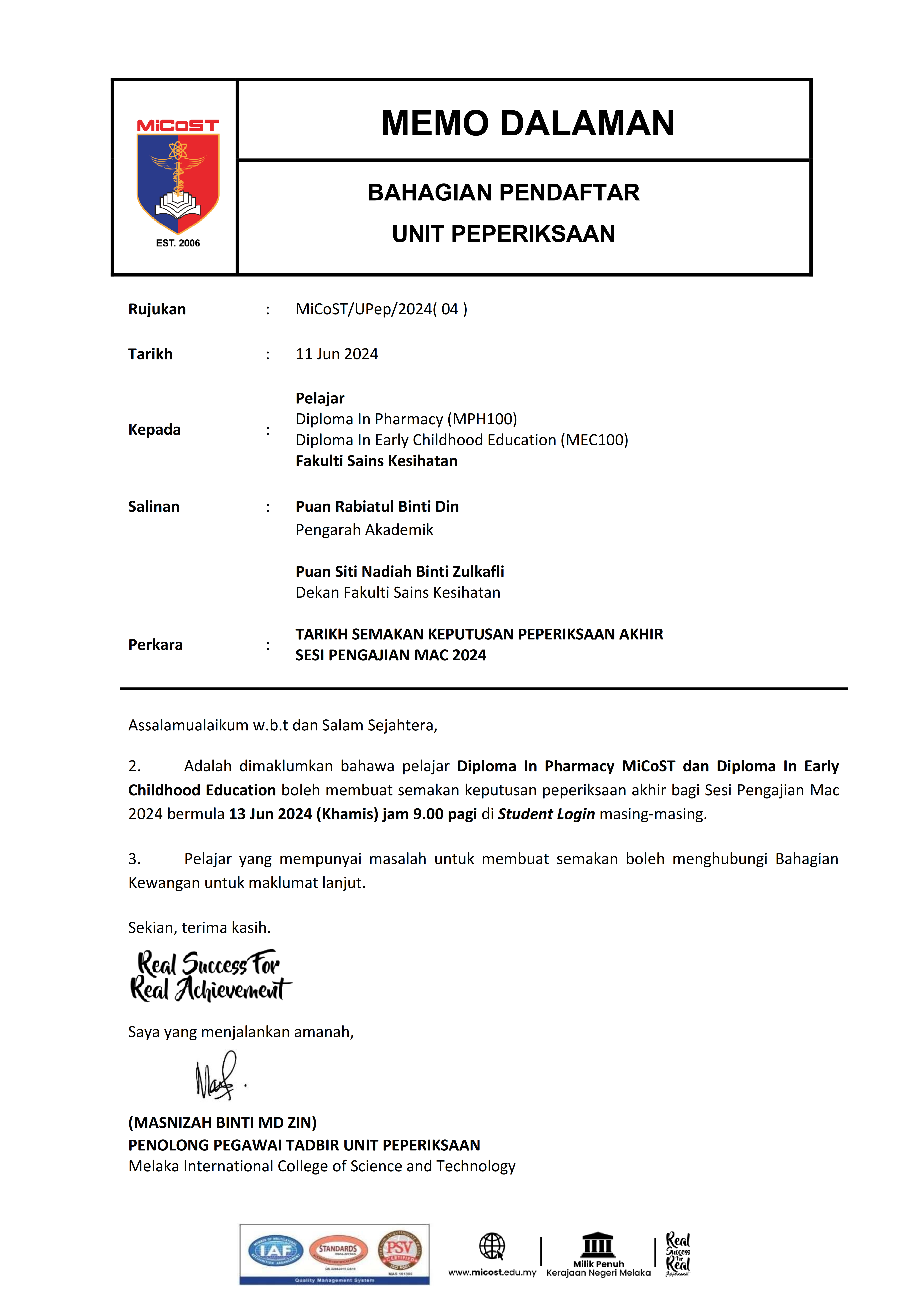 MEMO SEMAKAN TARIKH KEPUTUSAN PEPERIKSAAN AKHIR (DIPLOMA IN PHARMACY DAN DIPLOMA IN EARLY CHILDHOOD EDUCATION)