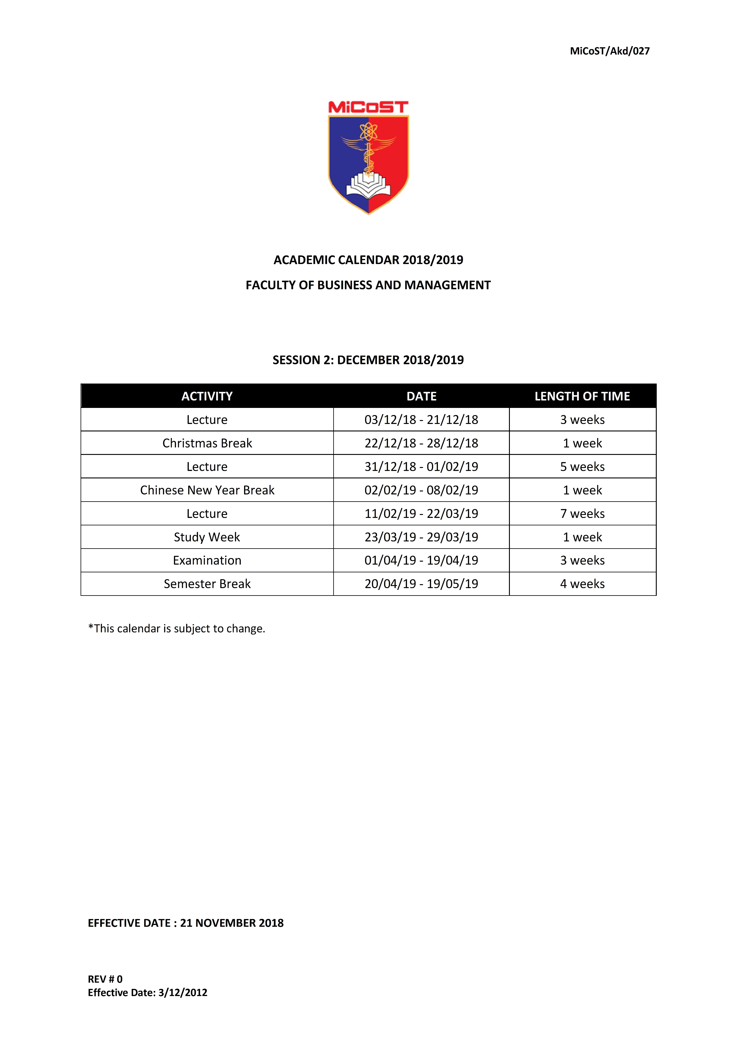 FBM - ACADEMIC CALENDAR DECEMBER 2018